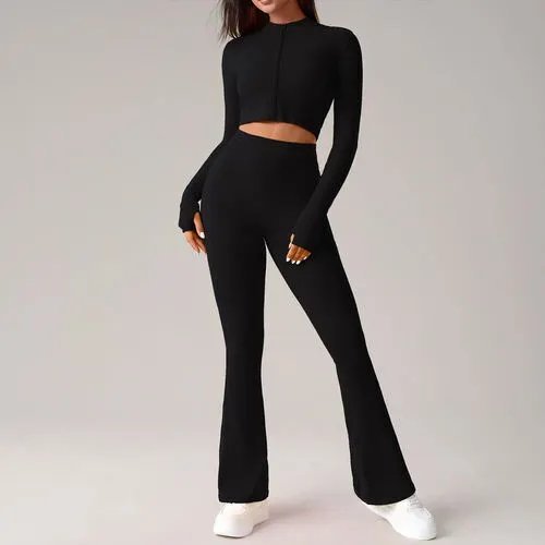 Neatly folded stacks of black zip-up athletic top and leggings with high collars on a habit fit sports factory table, showcasing bulk garment manufacturing of performance activewear.